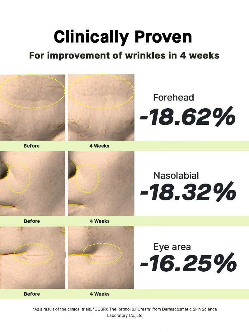 Η The Retinol 0.1 Cream από τη COSRX συνδυάζει καθαρή ρετινόλη 0.1% με καταπραϋντικά και ενυδατικά συστατικά, προσφέροντας ορατή βελτίωση σε ρυτίδες, πόρους, ελαστικότητα και ακνεϊκή τάση – χωρίς να «καίει» το δέρμα.